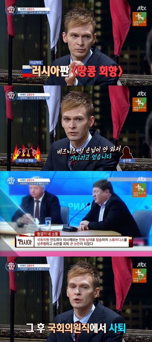 이어 "러시아 항공이 출발이 지연됐다. 비즈니스석 손님이 안와서 기다리고 있다고 했는데 알고 보니 국회의원이었다. 그런데 술 취한 상태로 탔고 스튜어디스 성추행도 했다. 결국 잘못을 인정하고 국회의원직에서 사퇴했다"고 전했다.