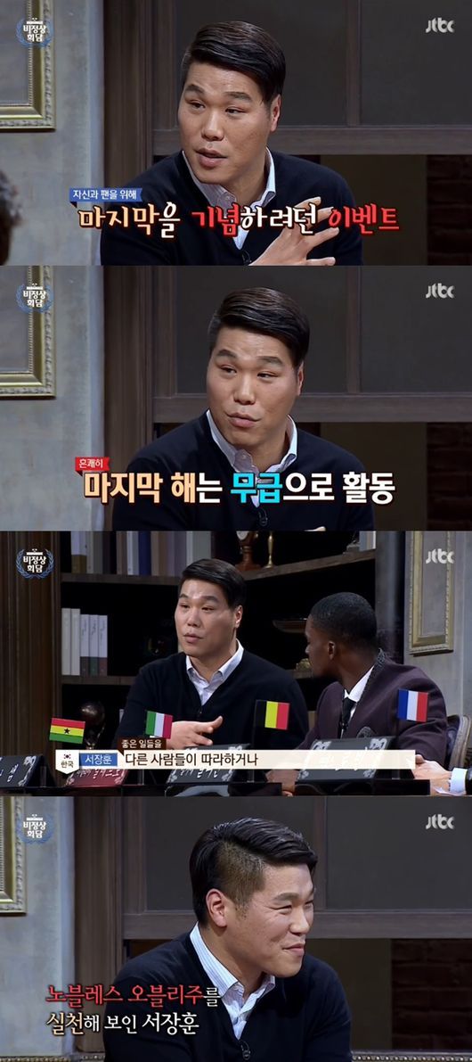 서장훈은 "원래 계획은 다른 이유 없이 마지막을 기념하려던 이벤트였다. 감사하는 마음으로 마지막해는 무급으로 활동했다"고 말했다.