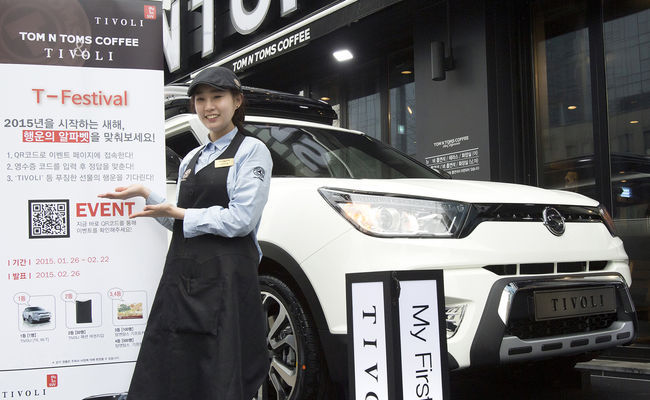 양사가 ‘티볼리’ 출시를 기념해 진행하는 ‘T-페스티벌’은 탐앤탐스 매장을 방문하여 쟁반 위의 트레이매트에 인쇄된 QR코드를 통해 이벤트 페이지로 접속, 구매영수증에 표기된 개별코드를 입력하여 응모할 수 있다.