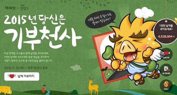 먼저 한게임 사이트에서는 ‘2015년 당신은 기부천사’ 코너를 통해 사랑의 날개를 기부하면 되는데, 1천만 날개를 달성하면 미션이 완성된다. 기존 고스톱 이용자라면 게임 이용만 하더라도 자동으로 기부 참여가 가능하다. 또 해피빈 사이트에서는 ‘당신은 나의 천사’ 코너에서 천사 응원 댓글을 남겨야 하며, 1004개의 댓글 완성이 목표다.