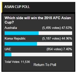 아시안컵 공식 홈페이지는 "누가 2015 아시안컵 우승팀이 될 것인가?"라는 설문에서 호주와 한국, UAE 세 팀을 두고 투표 중이다. 27일 오후 4시 30분 현재 1만 1530여 명이 투표한 가운데 개최국 호주가 약 48%(5495표)로 1위를 달리고 있다.