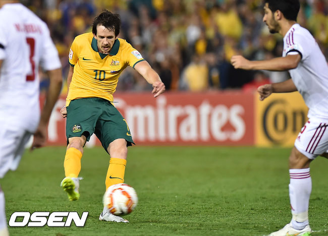 27일 오후 호주 뉴캐슬에서 열린 2015 AFC 아시안컵 준결승, 호주와 아랍에미레이트(UAE)의 경기, 후반 크루즈가 슛을 시도하고 있다.