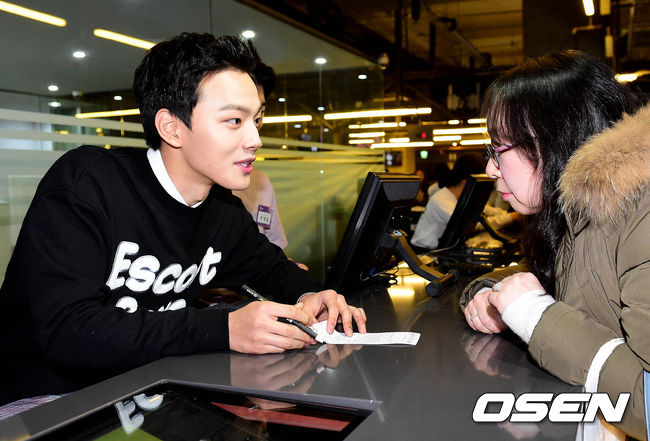27일 오후 서울 삼성동 메가박스 코엑스에서 열린 영화 '내 심장을 쏴롸' 일일스태프 행사에서 여진구가 티켓 판매를 돕고 있다.