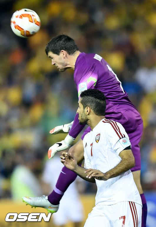 27일 오후 호주 뉴캐슬에서 열린 2015 AFC 아시안컵 준결승, 호주와 아랍에미레이트(UAE)의 경기, 후반 호주 라이언이 선방하고 있다.