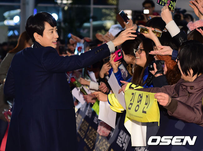 김명민이 팬들에게 초코릿을 나눠주고 있다.