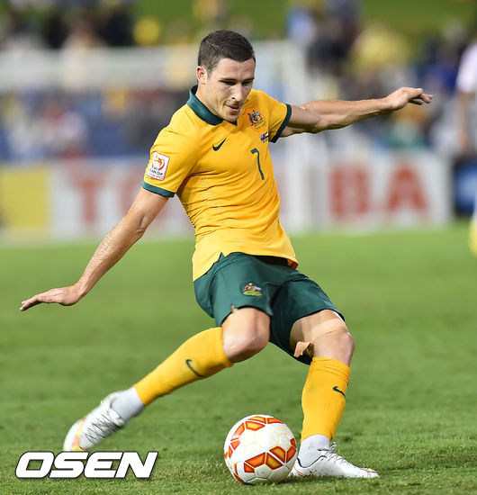 27일 오후 호주 뉴캐슬에서 열린 2015 AFC 아시안컵 준결승, 호주와 아랍에미레이트(UAE)의 경기, 후반 호주 레키가 슛을 시도하고 있다.