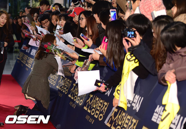 이연희가 무릎을 꿇고 팬들에게 사인을 해주고 있다.