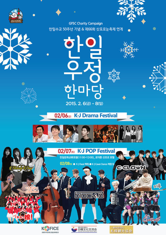 한국문화산업교류재단(이사장 이팔성)과 일본 삿포로관광협회(회장 호시노 히사오), NPO법인일한문화교류회(회장 이시바시 타쿠마)가 공동주최하는 '한일수교 50주년 기념 & 제66회 삿포로눈축제 연계 한일우정한마당'이 오는 2월 6일부터 8일까지 일본 삿포로에서 개최된다.
