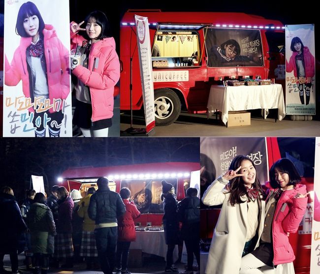 특히 신예배우 강민아의 팬들이 추위에 고생하는 동료 연기자 진지희, 혜리, 스테파니 리 등은 물론 스태프들에게 따뜻한 커피는 물론 수제쿠키와 샌드위치, 그리고 핫팩까지 준비해 추운 지방 촬영장에 온기를 불어넣었다.