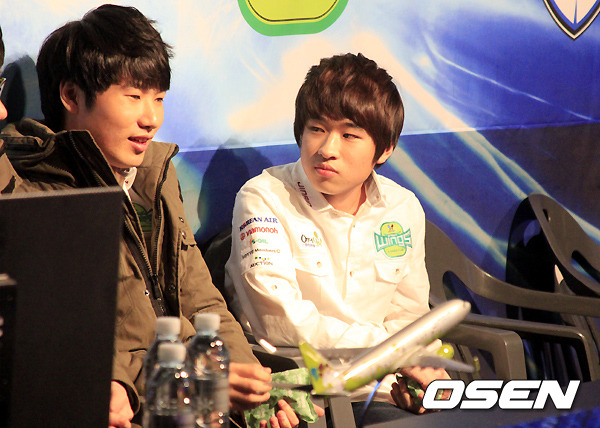 SK텔레콤 스타크래프트2 프로리그 2015시즌(이하 프로리그)이 27일 진에어와 프라임의 1라운드 6주차 4경기가 열렸다. 1세트에서 승리한 조성주가 동료들과 자리에 앉아 2세트 경기를 기다리고 있다.