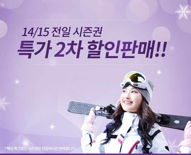 올 시즌 들어 두 번째로 특가 할인 판매되는 '14/15 전일 시즌권'은 대인, 소인 구분 없이 정상가격에서 50% 할인된 25만 원에 판매된다.