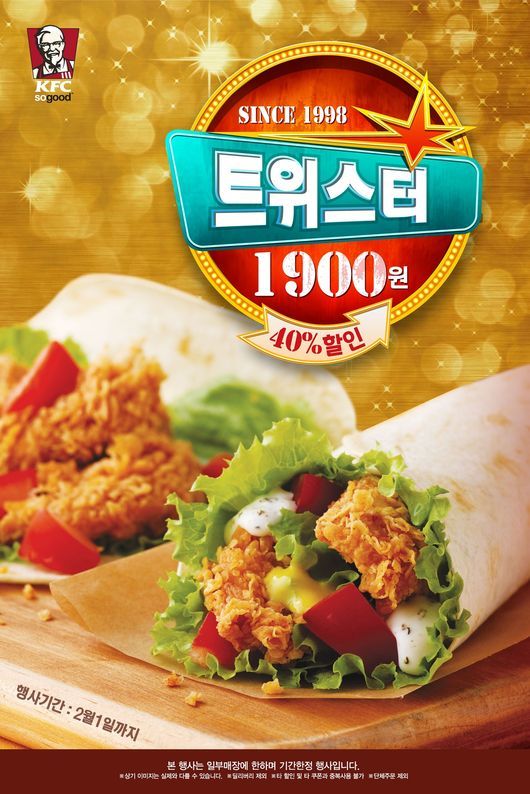 KFC(www.kfckorea.com)가 28일부터 2월 1일까지 '트위스터' 단품을 40% 할인한 1900원에 판매한다.