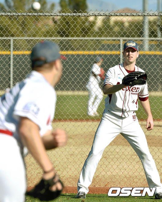 캠프에 뒤늦게 참가한 밴헤켄이 바로 캐치볼을 하고 있다./spjj@osen.co.kr