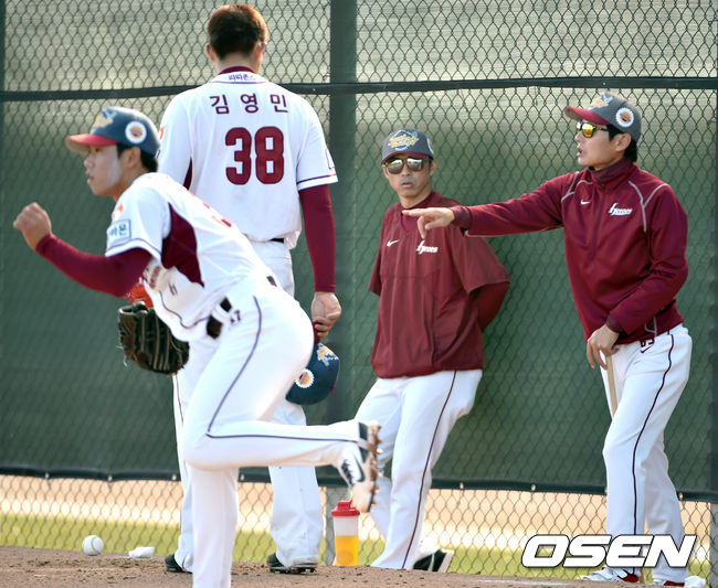 염경엽 감독이 김영민의 투구 밸런스에 대해 이야기해주고 있다./spjj@osen.co.kr