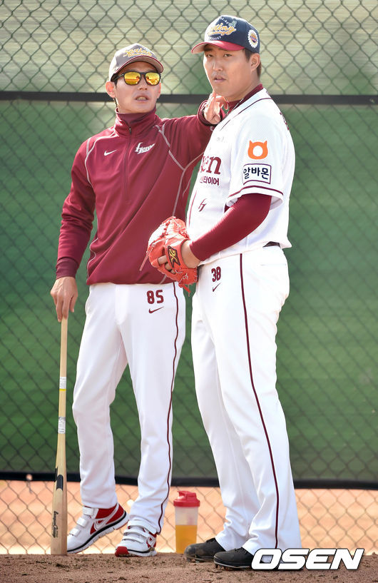 염경엽 감독이 김영민의 투구 자세를 교정해주고 있다./spjj@osen.co.kr