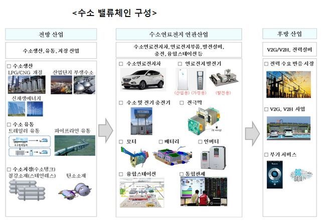 수소경제가 구현되면 수소생산, 수소저장(ESS), 수소유통 등 전방산업, 전력설비, V2G, V2H(Vehicle to Home: 친환경차와 주택간 상호 전력 공급 기술), 정보통신산업(ICT) 등 후방산업, 연료전지발전기, 연료전지차, 수소 및 전기 충전기, 인버터, 융합스테이션 등 연관 산업이 함께 발전해 국가경제에 미치는 파급효과가 있을 전망이다.