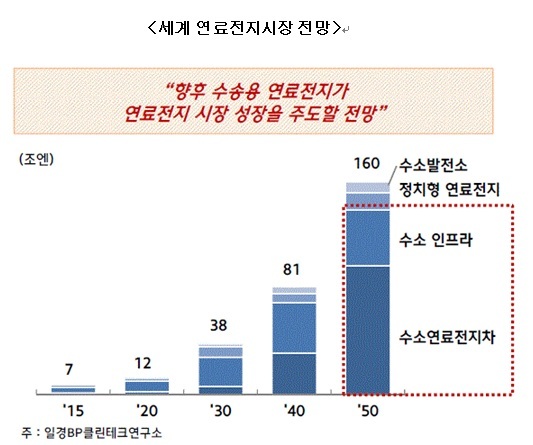 일본 닛케이 BP 클린테크연구소에 따르면 오는 2030년 세계 연료전지 시장 규모는 약 400조원으로 예상하고 있다. 국내의 경우엔 오는 2040년 기준으로 연료전지 산업규모가 약 107조 원에 달할 것으로 부경진 서울대 교수는 추정하고 있다. 생산 유발효과는 약 23조 5000억 원, 고용효과는 17만 3298명에 이른다.