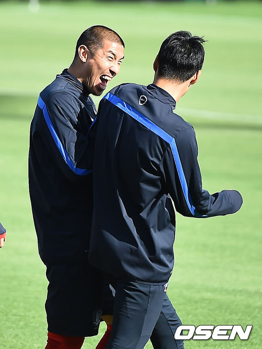 차두리가 조영철과 얘기를 하며 환하게 웃고 있다.