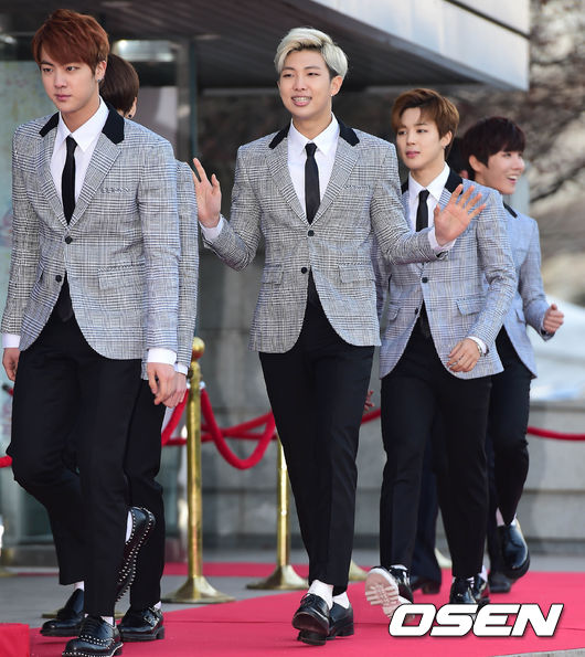 28일 오후 서울 올림픽 체조경기장에서 열린 '제4회 가온차트 K-POP 어워드' 레드카펫 행사에 방탄소년단이 참석하고 있다.