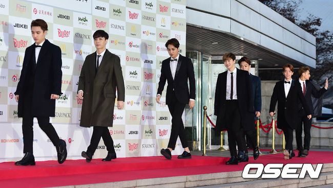 28일 오후 서울 올림픽 체조경기장에서 열린 '제4회 가온차트 K-POP 어워드' 레드카펫 행사에 엑소가 참석하고 있다.
