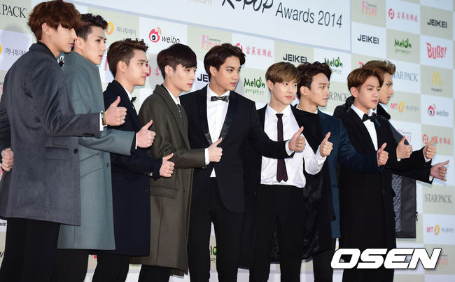 28일 오후 서울 올림픽 체조경기장에서 열린 '제4회 가온차트 K-POP 어워드' 레드카펫 행사에서 엑소가 포토타임을 갖고 있다.