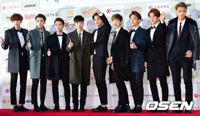 그룹 엑소가 28일 오후 서울 올림픽 체조경기장에서 열린 '제4회 가온차트 K-POP 어워드' 레드카펫 행사에 참석해 포즈를 취하고 있다.
