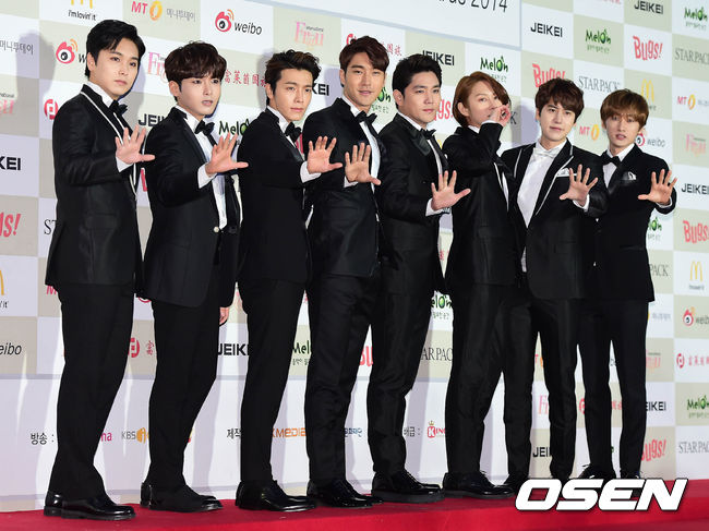 28일 오후 서울 올림픽 체조경기장에서 열린 '제4회 가온차트 K-POP 어워드' 레드카펫 행사에서 슈퍼주니어가 포토타임을 갖고 있다.
