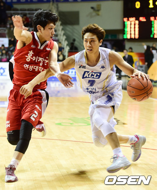 1쿼터, KCC 김태술이 KGC 김기윤 수비를 돌파하고 있다.