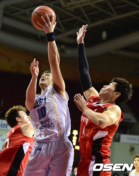 1쿼터, KCC 김태홍이 KGC 오세근 수비를 피해 골밑슛을 시도하고 있다.