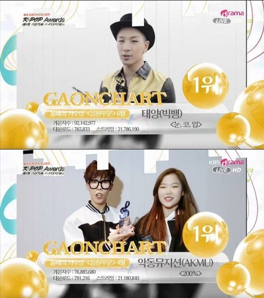그룹 악동뮤지션과 god, 가수 태양이 '제4회' 가온차트 K팝 어워드'에서 올해의 가수상을 받았다.