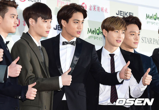 28일 오후 서울 올림픽 체조경기장에서 열린 '제4회 가온차트 K-POP 어워드' 레드카펫 행사에서 엑소가 포토타임을 갖고 있다.