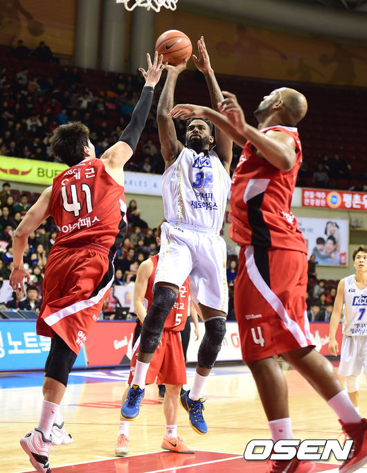 2쿼터, KCC월커슨이 KGC 오세근과 윌리암스 수비를 피해 슛을 시도하고 있다.