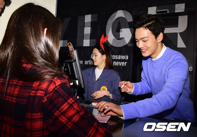 28일 오후 서울 CGV 홍대에서 열린 영화 '내 심장을 쏴라' 일일스태프 행사에서 배우 여진구가 티켓 판매를 돕고 있다.
