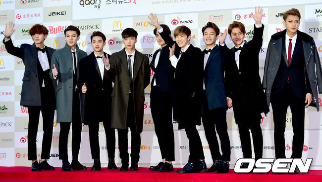 그룹 엑소가 28일 오후 서울 올림픽 체조경기장에서 열린 '제4회 가온차트 K-POP 어워드' 레드카펫 행사에 참석해 포즈를 취하고 있다.