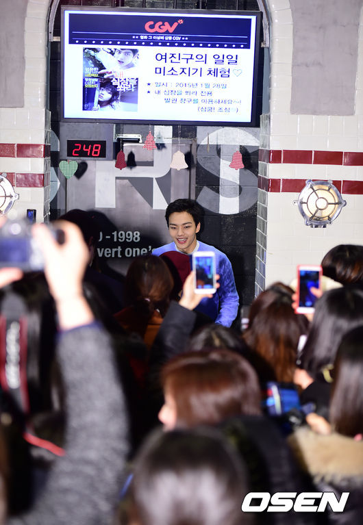 28일 오후 서울 CGV 홍대에서 열린 영화 '내 심장을 쏴라' 일일스태프 행사에서 배우 여진구가 티켓 판매를 돕고 있다.