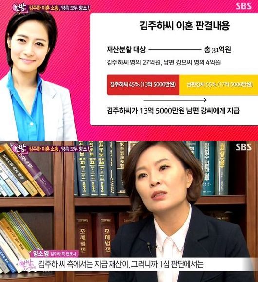 김주하 측 양소영 변호사는 28일 오후 방송된 SBS '한밤의 TV연예'에서 "(재산을) 둘이서 형성한 것이라면 많이 번 사람이 많이 가져가는 게 맞는데"라며 "부모님이 주신 재산이 재산 분할 대상이 됐다. 김주하 측에서는 억울할 수밖에 없다"고 말했다.