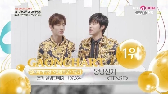 그룹 동방신기와 엑소, '제4회 가온차트 K팝 어워드'에서 올해의 앨범상을 받았다.