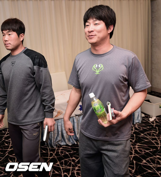 kt위즈 주장 신명철이 미팅 후 숙소로 이동하고 있다