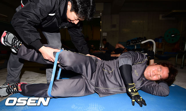 kt위즈 용덕한이 근력훈련을 하고 있다.