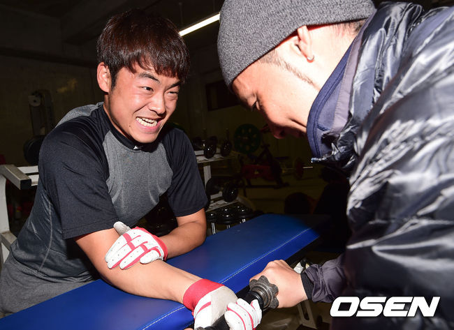 kt위즈 이성민 팔 근력훈련을 하고 있다.