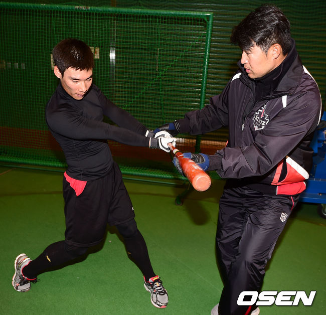 kt위즈 이숭용 코치가 송민섭의 타격 훈련 자세를 교정하고 있다.
