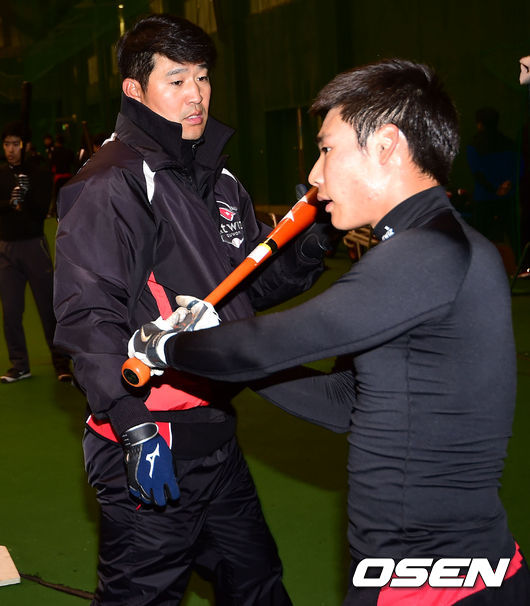 kt위즈 이숭용 코치가 송민섭의 타격 훈련 자세를 교정하고 있다.