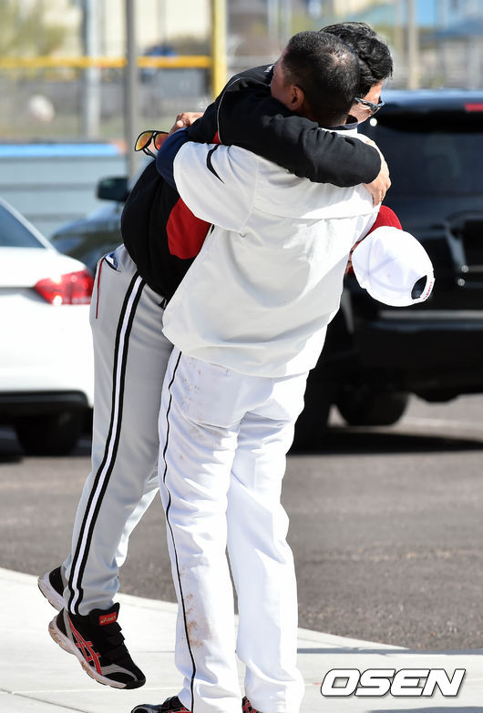 이상훈 코치가 캠프를 방문한 LG 양상문 감독을 번쩍 들어올리고 있다./spjj@osen.co.kr