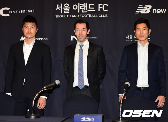 29일 오후 서울 여의도 렉싱턴 호텔에서 열린 서울 이랜드 FC 공식기자회견에서 김영광(왼쪽부터), 마틴 레니 감독, 김재성이 포즈를 취하고 있다.