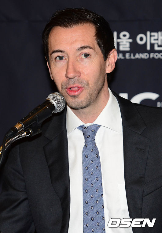 29일 오후 서울 여의도 렉싱턴 호텔에서 열린 서울 이랜드 FC 공식기자회견에서 마틴 레니 감독이 인사말을 하고 있다.