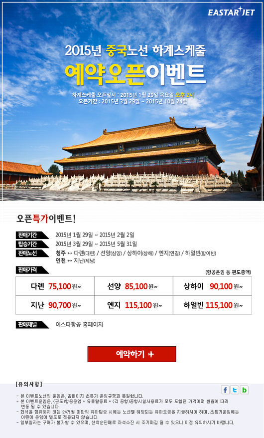 이스타항공은 2015년 3월 29일부터 5월 31일까지의 중국노선 하계 스케줄 항공권 특가 항공권 예약을 오픈한다고 29일 밝혔다.