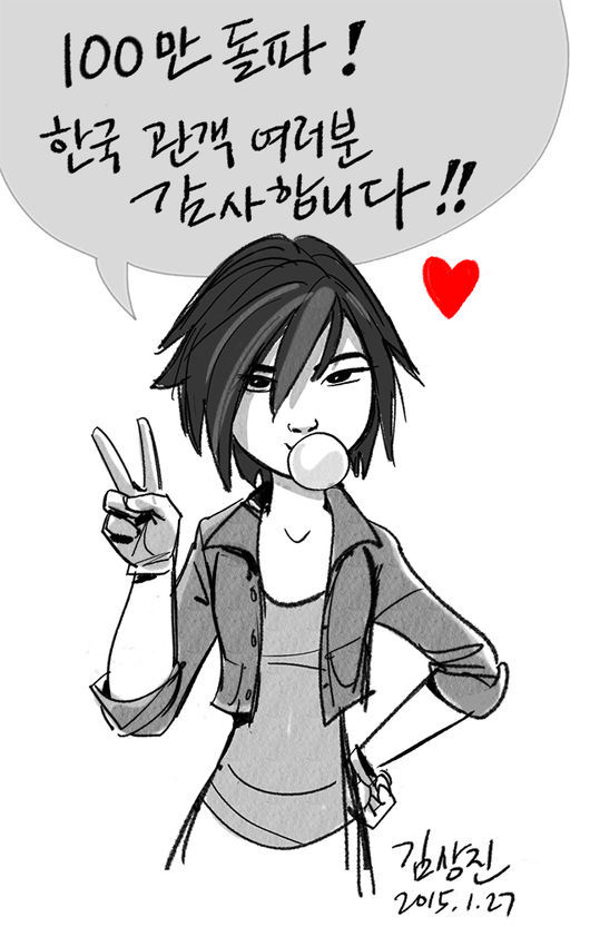 애니메이션 ‘빅 히어로’가 100만 관객을 돌파, 김상진 캐릭터 디자이너가 한국 관객들을 향한 감사 축전을 보내와 눈길을 끌고 있다.