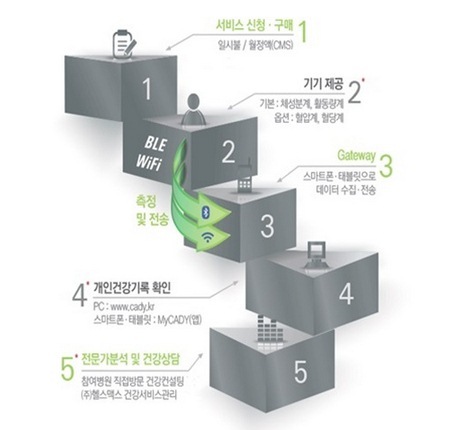 비만·건강관리 서비스는 기존 건강관리 서비스와는 달리 스마트 기기로 측정한 데이터를 스마트폰 앱을 이용해 편리하게 저장할 수 있으며, 이용 과정은 크게 5단계로 이루어진다. 이용자가 서비스를 신청하면 체성분계, 활동량계, 혈압계, 혈당계가 제공되고 측정·저장된 데이터를 활용하여, 직접 방문시 전문가 분석 및 운동처방 등 비만·건강 관리 컨설팅을 받을 수 있다.
