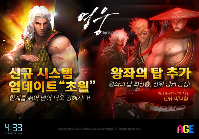 네시삼십삼분(이하 4:33)은 썸에이지가 개발한 모바일 액션 RPG(역할수행게임) '영웅'이 초월, 랜덤 진화 등 기존 영웅 캐릭터를 활용할 수 있는 새로운 시스템이 업데이트됐다고 29일 밝혔다.