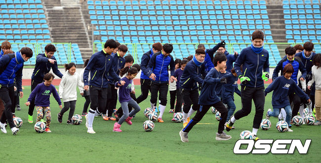 29일 오후 서울 효창운동장에서 열린 서울 이랜드 FC 공개훈련 행사에서 선수단이 어린이들과 함께 공을 차고 있다.